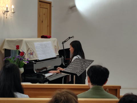 ピアノ演奏をされる掛江とも子姉、この日が新しいピアノのお披露目でした。