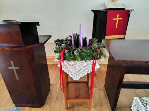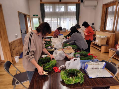 11月24日(月)午前10時よりクリスマス・リース作りを行いました。牧師館庭にある糸杉の枝をきり土台の輪に括り付け装飾を行いました。高橋和恵姉が中心となり教会員8名の他に遠藤清賢信徒の長女家族3名も加わり11名でのリース作りでした。